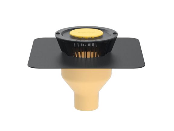 A thermally insulated cast polyurethane rainwater outlet with a vertical spigot giving thermal continuity. The outlet comes with a pre-attached bituminous flange to ensure waterproofing integrity between the outlet and membranes. The BRE Certified (report no. HPR357-303748) high thermal value of the rigid foam body prevents condensation from forming on the underside of the outlet body.