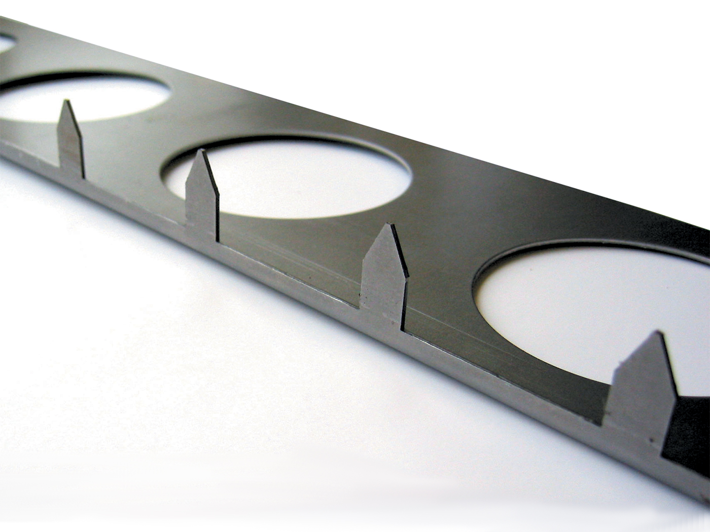 A flat steel rail with a series of small spikes designed to retain XF 301 sedum blankets on pitched roofs. The strip is fixed to the roof using lengths of Bauder roofing membrane to prevent penetration of the waterproofing.