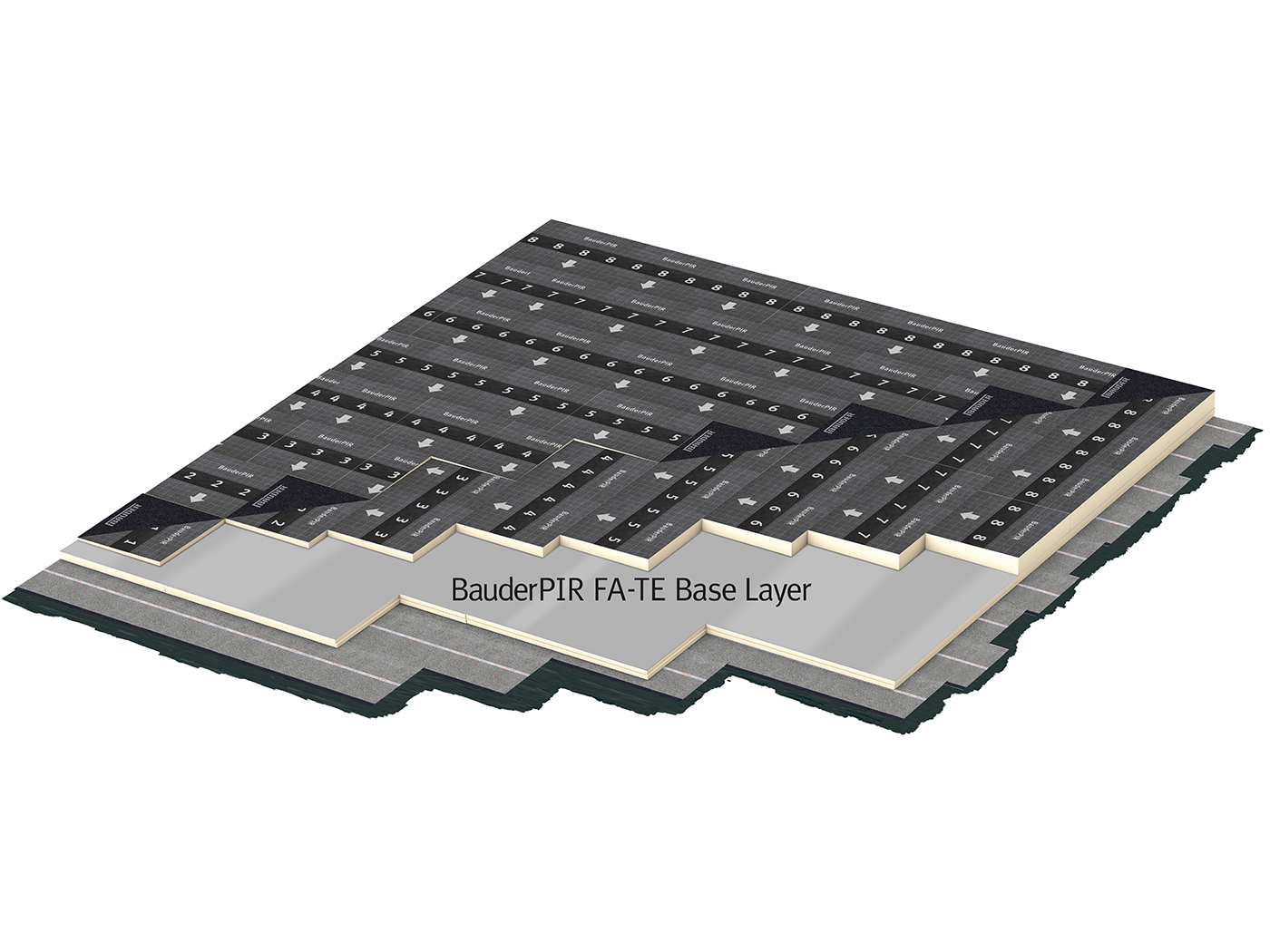 Rigid polyurethane foam board faced on both sides with aluminium foil. The top facing features a number and arrow to indicate board size and direction of fall and also has a printed grid pattern to aid cutting on site.