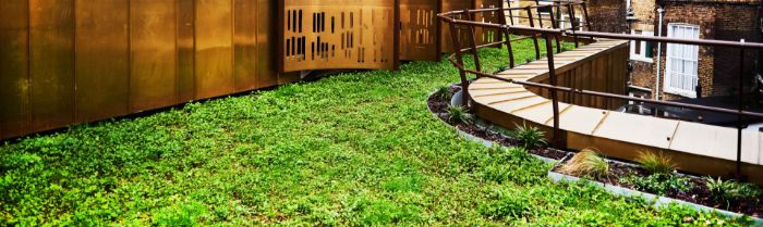 Creating a blue roof beneath a green roof finish for high volumes of stormwater attenuation.