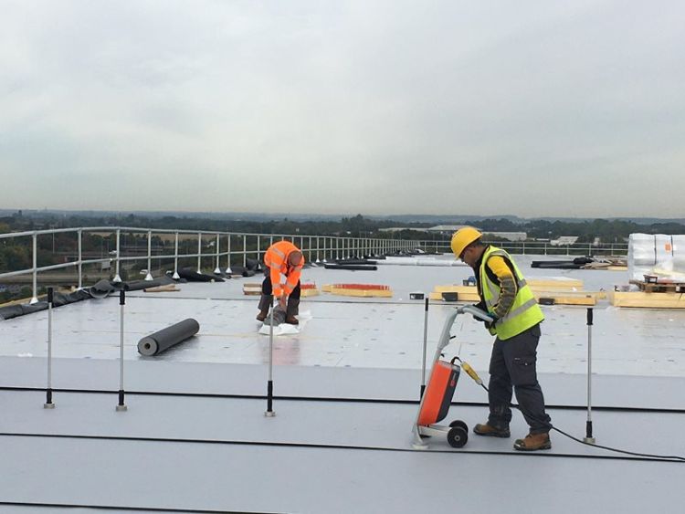 A wind load calculation was carried out by Bauder prior to the specification to determine the correct type and quantity of fasteners needed for the intallation. SFS supplied the fasteners on this project and therefore included as part of the comprehensive Bauder guarantee. It was at this time that a cost comparison took place between traditional lap fixing of the membrane and installation through induction welding. By extending the width of the Thermoplan membrane roll from a standard 1.5 m to 2 m, and induction welding the system, considerable savings were passed on to the client for the waterproofing installation.