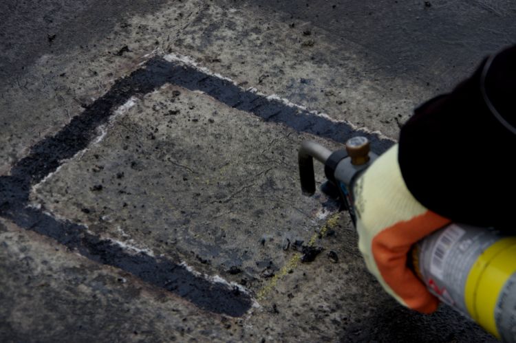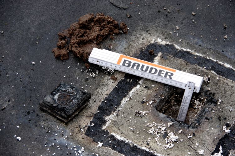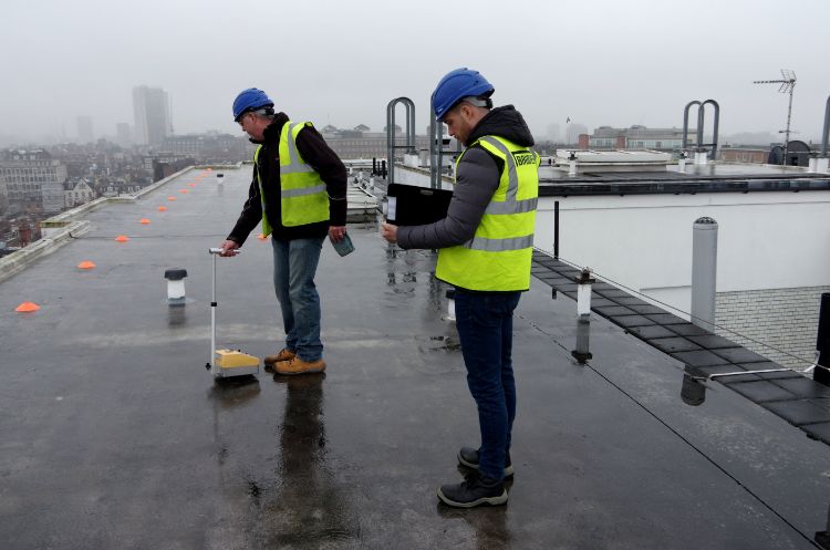 The survey is carried out using a nuclear device that directs neutrons into the waterproofing and insulation of the roof. Some of the neutrons emitted bounce back from hydrogen molecules in water to give a precise reading on the amount of moisture present.