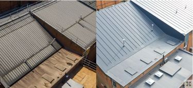 Old metal profile roof on a school before refurbishment and showing the completed roof following installation of Bauder Profiled PIR Overlay System.